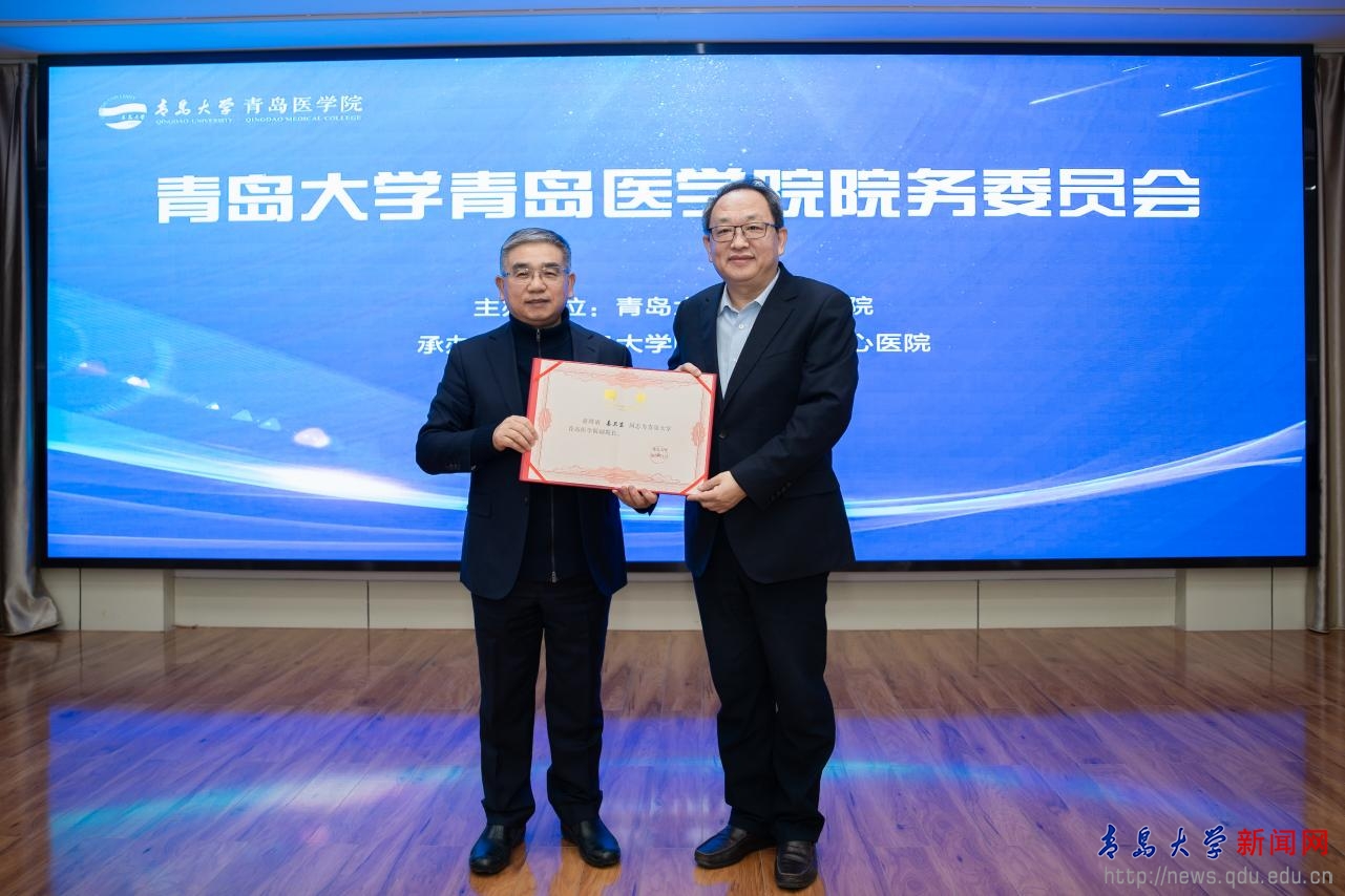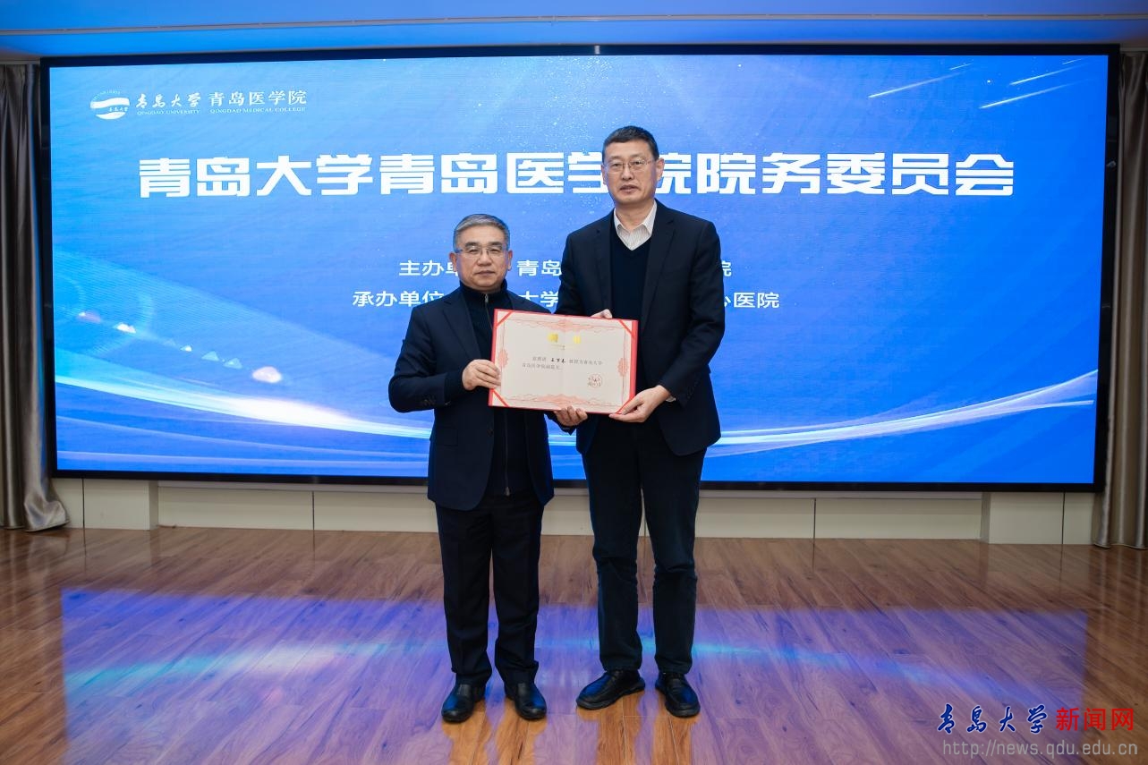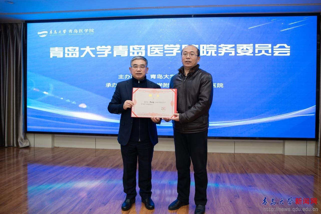 會前,李榮貴宣讀《關于調整青島大學青島醫學院院長、副院長聘任及院務委員會的通知》。胡金焱為新任院長、副院長頒發聘書。