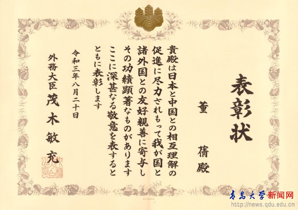 在收到日本政府頒發的“日本外務大臣獎”這份榮譽后董蒨表示,這是責任也是使命,自己會一直堅持做“中日友誼”的文化傳遞使者,為兩國更好的交流貢獻自己的一份力。