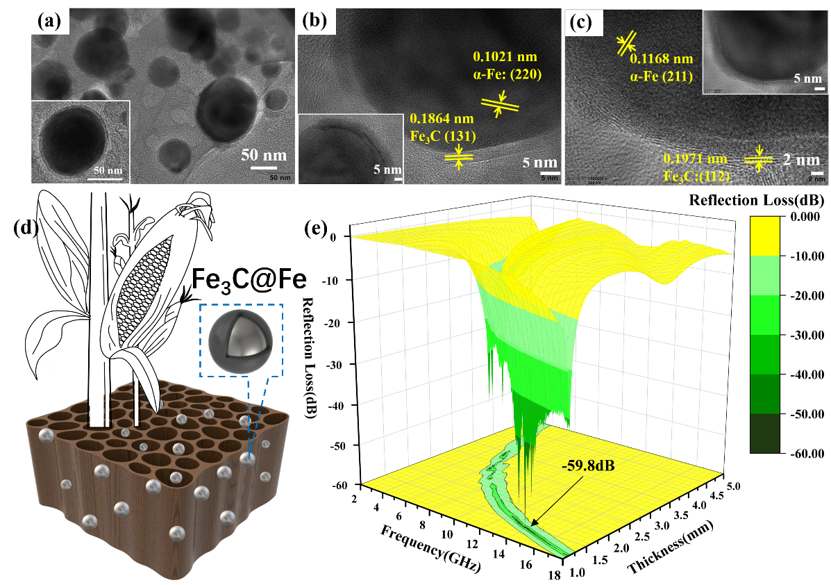 各種電子設備的應用在給人們生活帶來方便的同時也帶來了大量的電磁污染,影響人們的健康和信息安全,應對電磁污染的有效手段是發展電磁波吸收材料。但現階段許多電磁波吸收材料存在吸收帶寬窄、制備工藝復雜等問題。本項研究以常見的玉米秸稈為原料,利用秸稈天然的多孔結構通過簡單的生物質轉化法制得超輕的Fe3C@Fe/C納米吸波材料,在超薄的厚度(1.13 mm)下即可實現優異的吸波性能(RL = -59.8 dB),其有效吸收帶寬可達5.1 GHz。此工作還可以提高農業廢料的利用效率,減少秸稈焚燒帶來的環境污染。