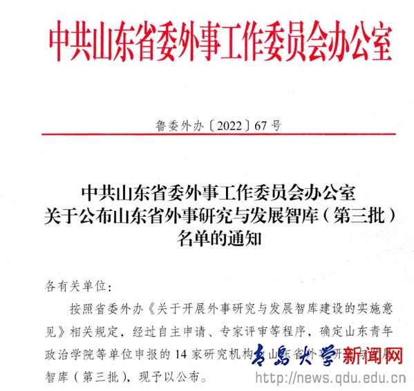 座談會(huì)上,公布了山東省外事研究與發(fā)展智庫(kù)(第三批)名單,確定14家研究機(jī)構(gòu)為山東省外事研究與發(fā)展智庫(kù),我校外語(yǔ)學(xué)院申報(bào)的“中德文化交流研究中心”成功入選,實(shí)現(xiàn)外語(yǔ)學(xué)院省級(jí)智庫(kù)平臺(tái)建設(shè)的突破。