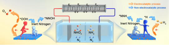 電化學(xué)催化氮?dú)夤潭ê铣砂焙拖跛幔徽J(rèn)為是有可能取代傳統(tǒng)Haber-Bosch和Ostwald工藝的新技術(shù)。然而,固氮反應(yīng)和水裂解副反應(yīng)間的動(dòng)力學(xué)差異導(dǎo)致催化選擇性低、活性差,如何實(shí)現(xiàn)高選擇性氮?dú)舛ㄏ蜣D(zhuǎn)化一直是阻礙該領(lǐng)域發(fā)展的重大挑戰(zhàn)。該工作首次將氮?dú)饣罨碚摲譃樗呀馍苫钚詺洹⒒钚匝醯碾娀瘜W(xué)過程和活性中間體與氮?dú)庾饔玫姆请娀瘜W(xué)過程,并基于反應(yīng)特點(diǎn)差異,開創(chuàng)性的將非連續(xù)的脈沖電催化應(yīng)用于電催化固氮領(lǐng)域:通過周期性的脈沖策略周期性更新能斯特?cái)U(kuò)散層活性物質(zhì)濃度,增強(qiáng)氮?dú)夂突钚灾虚g體的供應(yīng);緩解復(fù)雜電化學(xué)反應(yīng)中各基元反應(yīng)間的動(dòng)力學(xué)差異,實(shí)現(xiàn)二電極體系的高效氮?dú)膺€原氧化(NOR選擇性提升44.94倍,NRR選擇性提升7.8倍)。該工作為動(dòng)力學(xué)差異的多步耦合反應(yīng)的電催化過程傳質(zhì)優(yōu)化、選擇性提升提供了新的研究思路。