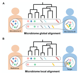 圖1.微生物組beta多樣性距離計算的(A)全局比對模式與(B)局部比對模式