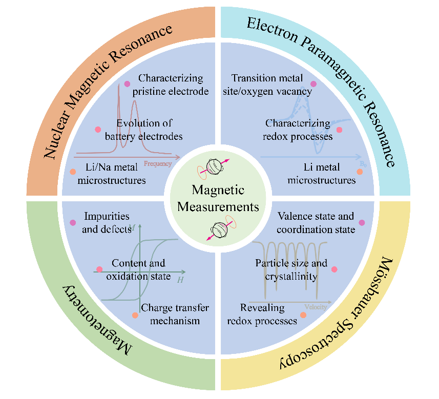新能源電池充放電過程常伴隨著晶格結構和能帶結構的物理改變,明確界面過程的基本物理圖像,對于優化能源系統性能指標具有重要意義。二次電池發展的瓶頸問題已經深入到了晶格場,電子軌道分布,自旋軌道耦合作用等更深層更復雜的科學領域,超出了單一常規表征手段的分析能力,也超出了單一學科的知識范疇。大量儲能電極材料中富含過渡族金屬元素,這些含有過渡金屬元素的電極材料的晶格結構、電子構型、電化學性質等與磁性密切相關,這為磁性表征電化學過程提供了可能。經過漫長的發展,磁學形成了深厚系統的理論基礎以及分析表征手段,既能從原子離子等尺度分析材料的性質和特點,又能從晶體場,晶格結構,耦合作用等角度出發,分析電化學過程材料深層次機理, 具有廣闊的應用空間和鮮明的研究優勢。該綜述全面系統地介紹了磁學測量技術在儲能領域中的應用,分析了磁性、電子結構與電化學性能之間的密切聯系。最后,對磁電化學測量當前面臨的挑戰和未來的發展方向進行了討論展望。