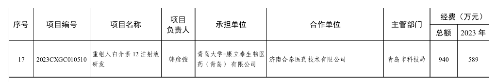 新聞網(wǎng)訊 近日,2023年度山東省重點研發(fā)計劃(重大科技創(chuàng)新工程)立項項目名單公布,青島大學(xué)醫(yī)學(xué)部分子醫(yī)學(xué)與新藥研究院和康立泰生物醫(yī)藥(青島)有限公司主持的重組人白介素12注射液項目成功獲批山東省財政資金940萬立項支持。