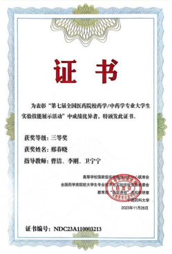 新聞網訊 11月24日-26日,由教育部高等學校國家級實驗教學示范中心聯席會、全國藥學類院校大學生專業技術與實驗技能競賽組委會、教育部“藥學課程”虛擬教研室和中國藥科大學共同舉辦的 “第七屆全國醫藥院校藥學/中藥學專業大學生實驗技能展示活動”在貴州遵義召開。我校藥學院2020級本科生王文靜、邢春曉分別斬獲競賽二等獎和三等獎。