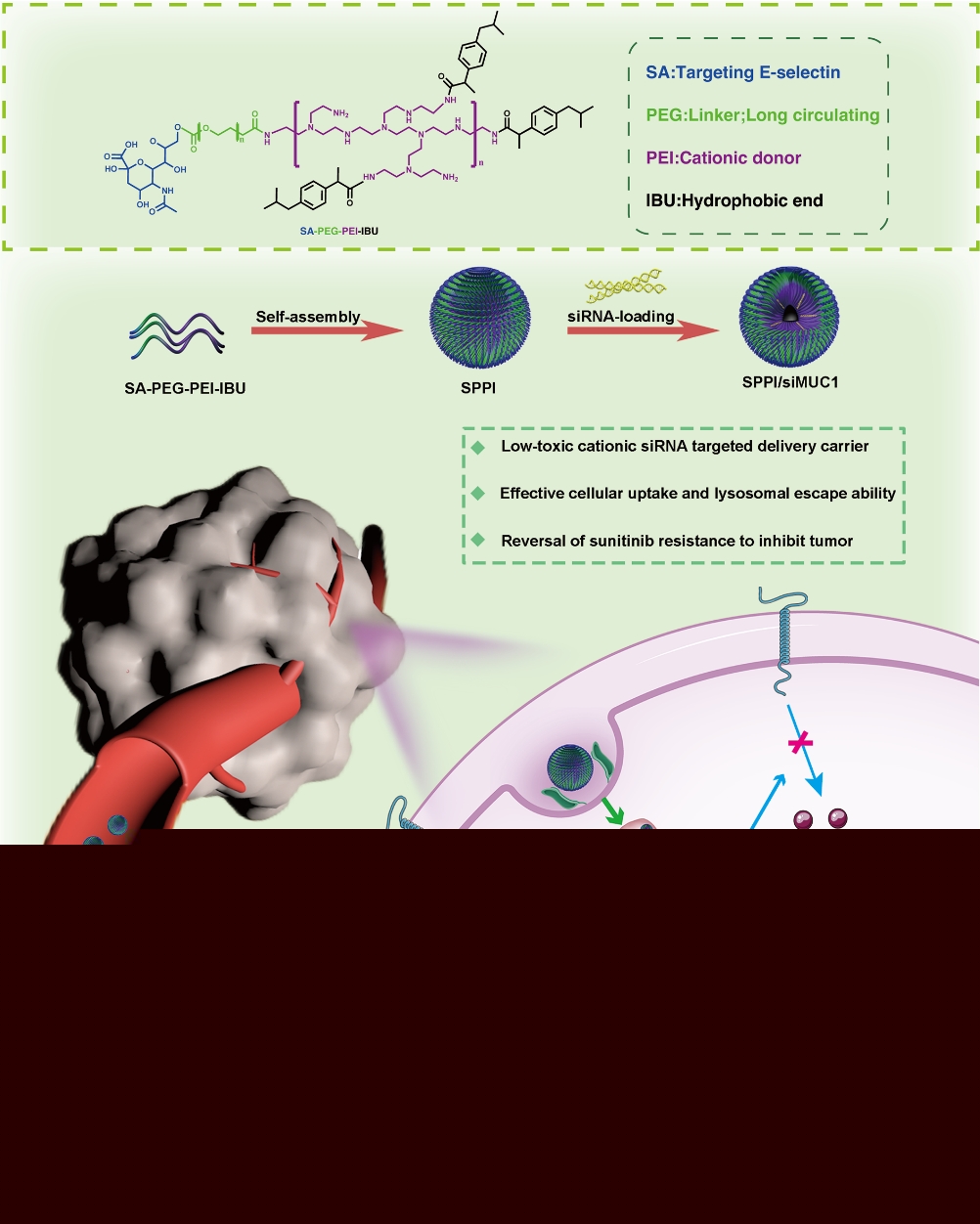 基于以上研究背景,孫勇課題組設(shè)計(jì)并合成了一種基于唾液酸、聚乙二醇、聚乙烯亞胺和布洛芬的聚合物SPPI,用其負(fù)載siRNA以實(shí)現(xiàn)靶向腫瘤組織的基因干擾,顯著下調(diào)了腫瘤組織內(nèi)MUC1的水平,對(duì)脂質(zhì)代謝中的膽固醇合成有著較強(qiáng)的抑制作用,這進(jìn)一步下調(diào)了與膽固醇外排相關(guān)的P-GP,ABCG2和MRP1等多種耐藥相關(guān)蛋白的表達(dá),實(shí)現(xiàn)了逆轉(zhuǎn)腫瘤細(xì)胞對(duì)于化療藥物舒尼替尼的耐藥性,同時(shí)減少了腫瘤微環(huán)境中炎癥因子的分泌,抑制腫瘤的轉(zhuǎn)移。