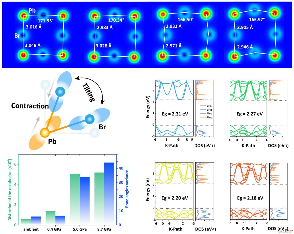 二維有機-無機雜化鹵化鉛材料因其獨特的量子限域效應在光電器件研究中備受關注。然而,這類材料在常壓下結構變化小,熒光發射不易實現寬光譜覆蓋,難以滿足多種應用場景的要求。高壓作為獨立于溫度與組分的物理參量,可以有效調控材料晶格中的原子距離和電子結構,已發展成為設計合成新材料與性能調控的重要手段。本研究團隊設計制備出一例壓力調控熒光發射的二維雜化鹵化鉛材料,(ETA)2PbBr4(ETA =乙醇胺陽離子)。在靜水壓調控下,其發光范圍可由藍紫光區(424 nm)調諧至橙紅光區(620 nm);同步輻射高壓X-射線衍射和高壓拉曼實驗證實,晶體在靜水壓作用下,經歷了由常壓相Pbcn到高壓相P21/c的相轉變過程。理論計算與機制研究揭示了不同壓力下晶體結構演化過程和能帶結構變化,以及化學氫鍵相互作用在高壓相轉變過程和高壓全可見光譜發射的重要作用。該工作為實現單一組分材料的全光譜覆蓋發射提供了新的解決方案,有助于推動基于單一組分光電器件的進一步發展。