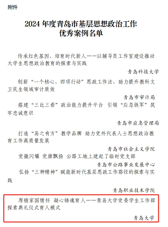 新聞網訊 近期,青島市職工思想政治工作研究會公布了2024年度基層思想政治工作優秀案例評選結果,我校《厚植家國情懷凝心鑄魂育人——青島大學黨委學生工作部探索典禮儀式育人模式》工作案例入選。