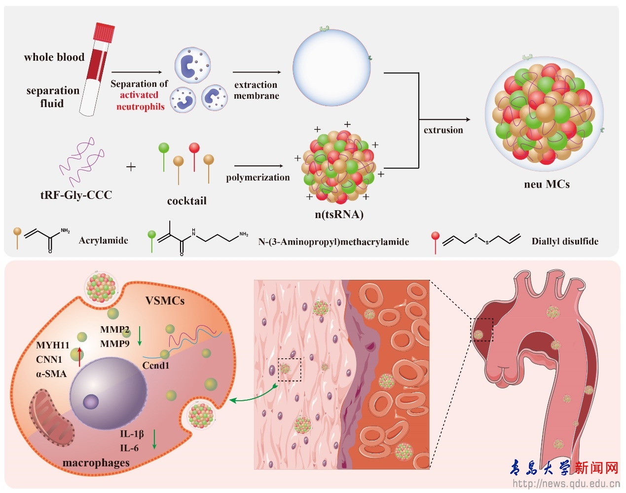 新聞網訊 近日,轉化醫學研究院于濤教授、亓洪昭教授團隊在心血管靶向基因藥物遞送研究方面取得新進展,研究發現了一個新的AAD治療靶點-tRF-Gly-CCC,相關研究成果以“Activated neutrophil membrane-coated tRF-Gly-CCC nanoparticles for the treatment of aortic dissection/aneurysm”為題發表在《Journal of Controlled Release》(中科院期刊分區1區,TOP期刊,IF=10.5)。本文第一作者為轉化醫學研究院2021級碩士研究生李天翔和基礎醫學院楊艷艷副教授,通訊作者為于濤教授和亓洪昭教授。該研究得到國家自然科學基金委、山東省自然科學基金委等項目資助。