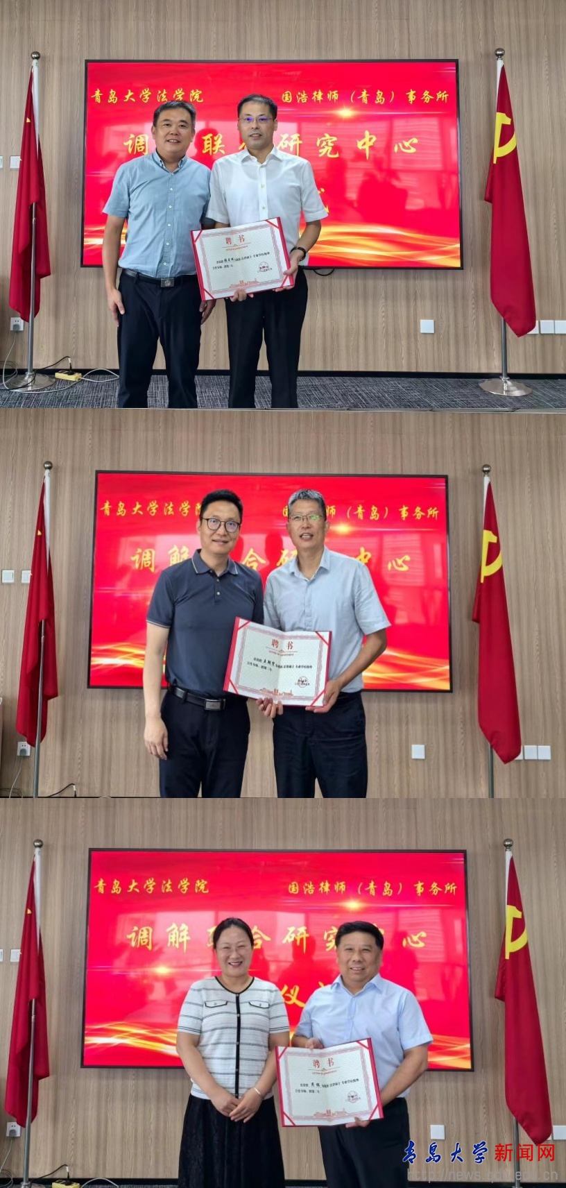 會上,雙方簽訂了《共建調解聯合研究中心合作協議》,并為張日輝、王朝賢、周鵬頒發了青島大學法學院研究生校外合作導師聘書。