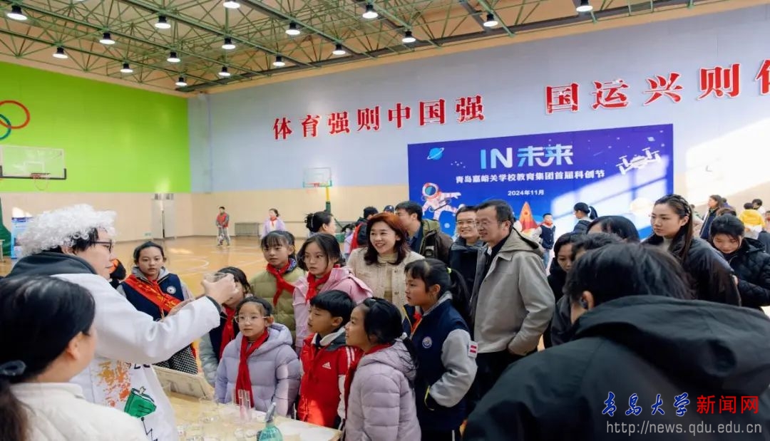 在青島嘉峪關學校教育集團科創節啟動儀式上,郝偉致辭,他介紹了青島大學應用物理國家級實驗教學中心相關情況,表示學院將會發揮好自身優勢,積極為學校提供優質的科學教育資源,助力學生科學思維和創新基因的培育和成長。隨后,物理科學學院與青島嘉峪關學校簽署科學教育協同育人合作協議,并在嘉峪關小學成立青島大學物理科學學院“科學教育實踐基地”,學院教師被聘為青島嘉峪關學校教育集團少年科學院導師。