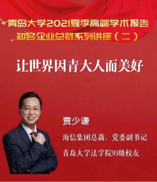 王靜院長(zhǎng)讓我定一個(gè)報(bào)告的題目,我說定《讓世界因青大人而美好》。這個(gè)題目有點(diǎn)大,但很切題。青大傳遞給世界的美好在于青大人身上,就像海信的使命“致力于科技創(chuàng)新,提升人類生活品質(zhì),幸福億萬家庭”。